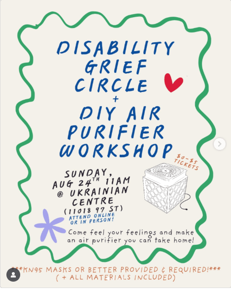 August 24th, Sunday – Disability Grief Circle & DIY Air Purifier Workshop: “Join us for a Disability Grief Circle and DIY air purifier workshop this coming Sunday, August 24th at 11am – 1pm at the Ukrainian Centre (11018 97 St)!