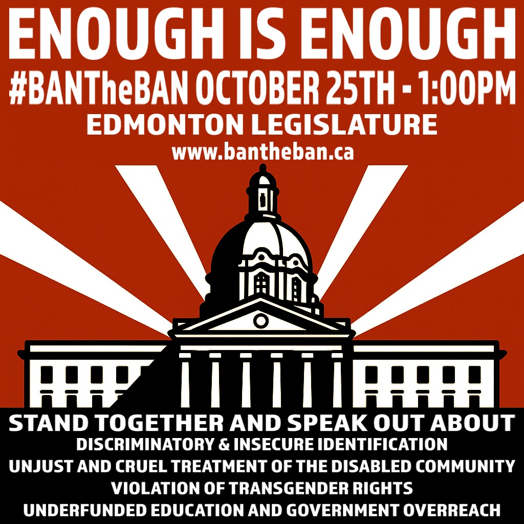 October 25th, Saturday – Enough is Enough – Ban the Ban: We come together, united in our diversity and separate issue, to tell the government that they are failing present and future Albertans and the planet.