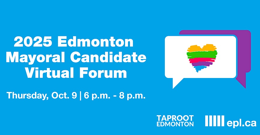 October 9th, Thursday – 2025 Edmonton Mayoral Candidate Forum – Virtual Event: “The Edmonton Public Library, in partnership with Taproot Edmonton, invites you to a nonpartisan and engaging forum featuring Edmonton’s mayoral candidates.