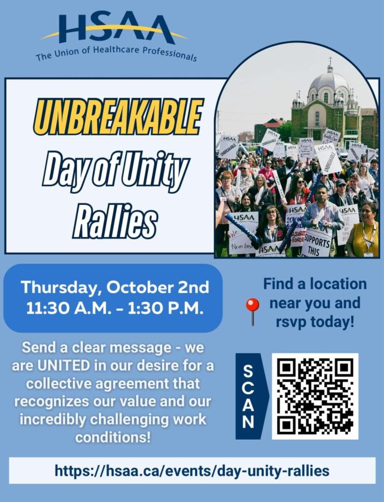 October 2nd, Thursday – Unbreakable Day of Unity Rallies: Rallies are being held across Alberta (Edmonton, Calgary, Red Deer, Lethbridge, Medicine Hat, St. Albert, Fort McMurray, and Grande Prairie). This is being coordinated by HSAA (Health Sciences Association of Alberta).