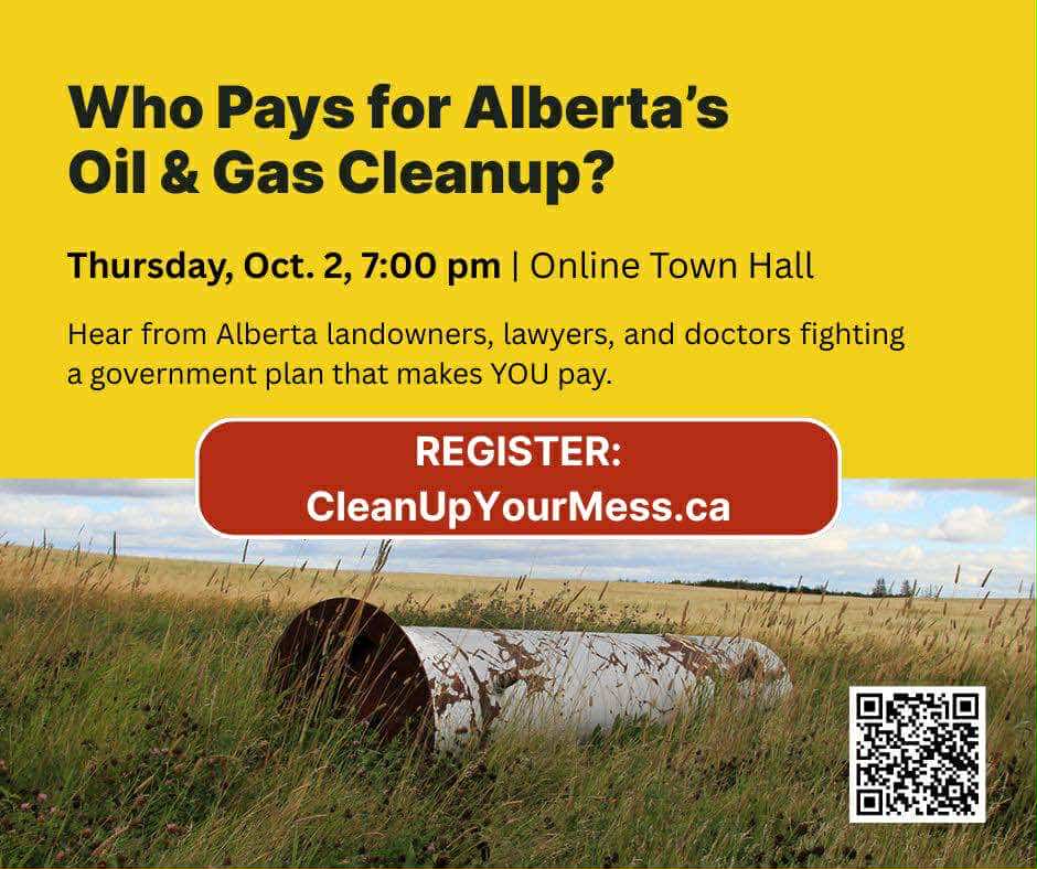 October 2nd, Thursday – Who Pays for Alberta’s Oil & Gas Cleanup?: “On October 2nd, we’re gathering online with allies from across Alberta to expose the government’s drill-and-dash plan for oil and gas wells – and reveal our plan to stop industry from leaving us with the bill.”