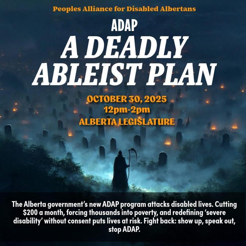 On Thursday, Oct 30 • 12–2 pm • Alberta Legislature (Edmonton) we’re gathering to say no to forced transfers off AISH and no to deeper poverty. This rally is organised by the People’s Alliance for Disabled Albertans (PADA)—disabled people, families, and allies
