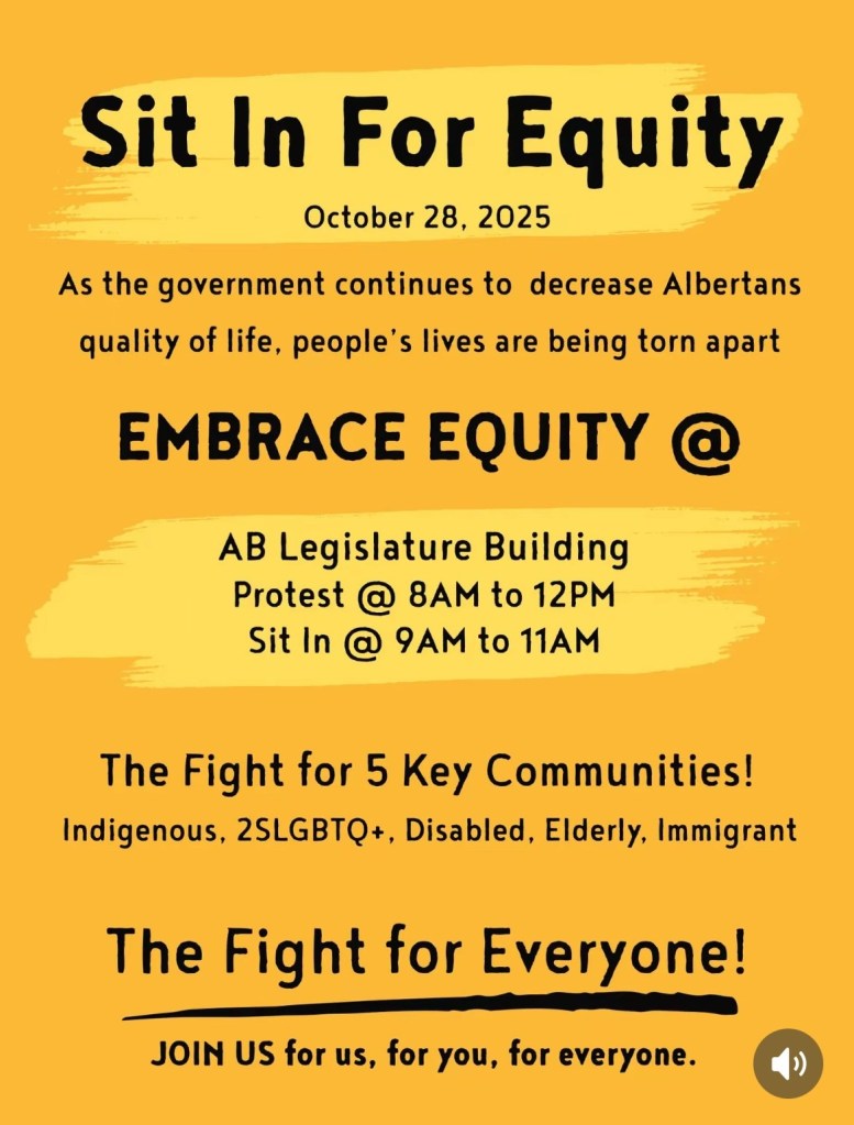 October 28th, Tuesday – Sit in for Equity: “Join us to Sit In for Equity on October 28, 2025. We are standing up (and sitting down) for the right to equity: life, liberty, and security for all Indigenous, 2SLGBTQ+, Elderly, Immigrant, and Disabled Albertans.”