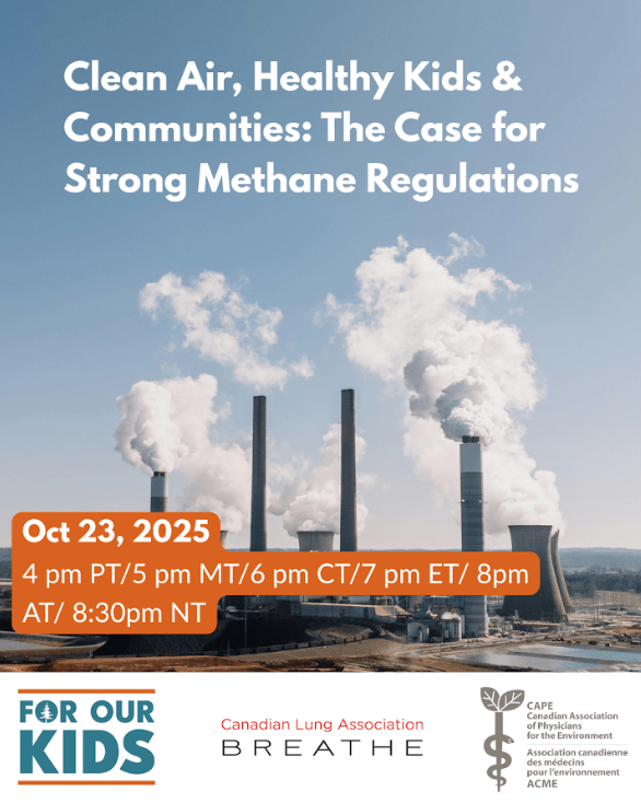 October 23rd, Thursday – Clean Air, Healthy Kids & Communities: The Case for Strong Methane Regulations: “Join us on October 23rd for an eye-opening webinar on methane pollution with leading scientists and policy experts. Learn why methane from the oil and gas industry is a dangerous super-pollutant harming our health, communities, and kids’ futures—and how it’s a problem we can actually fix. Discover the policy solutions on the table and why strong methane regulations could spark the next growth industry for Canada.