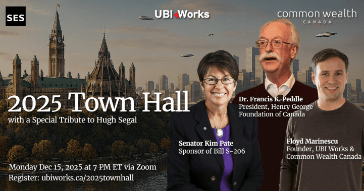 December 15th, Monday – UBI Works x Common Wealth Canada 2025 Town Hall: “Earlier this month (November), Senate Bill S-206 for a Guaranteed Livable Basic Income passed 2nd Reading and is now on its way to Committee. We’re excited to announce that Senator Kim Pate, the bill’s sponsor, will be a keynote speaker at our upcoming UBI Works x Common Wealth Canada 2025 Town Hall.