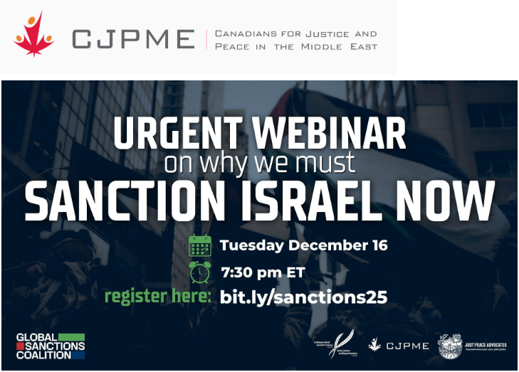 December 16th, Tuesday – Sanction Israel NOW: You are invited to join an important webinar on Tuesday, December 16 at 7:30PM ET, to hear from the Global Sanctions Coalition about our latest push to sanction Israel. You might be wondering why it is still so important to sanction Israel now, with the media and politicians focusing their attention on the so-called ‘ceasefire’ and Trump’s plan for Gaza. We will cover that and other important questions. “