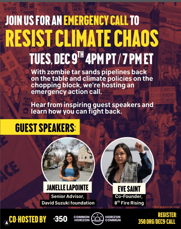 December 9th, Tuesday – Resist Climate Chaos: “There’s been a whirlwind of opposition since Prime Minister Carney signed a shocking energy deal with Alberta last week to build a toxic new tar sands pipeline and gut climate action policies.