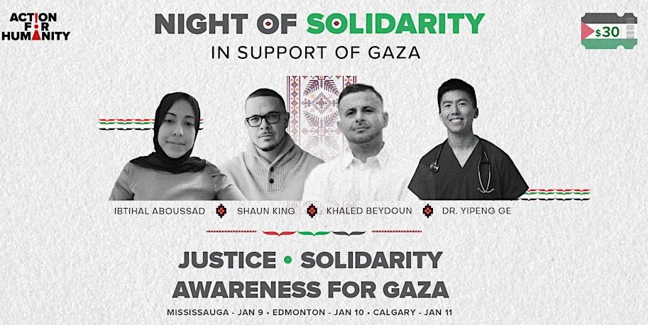 January 10th, Saturday – Night of Solidarity – Edmonton: Stand with Gaza: “Join us in Edmonton for Night of Solidarity, a powerful evening dedicated to standing with the people of Gaza through truth, unity, and collective action.