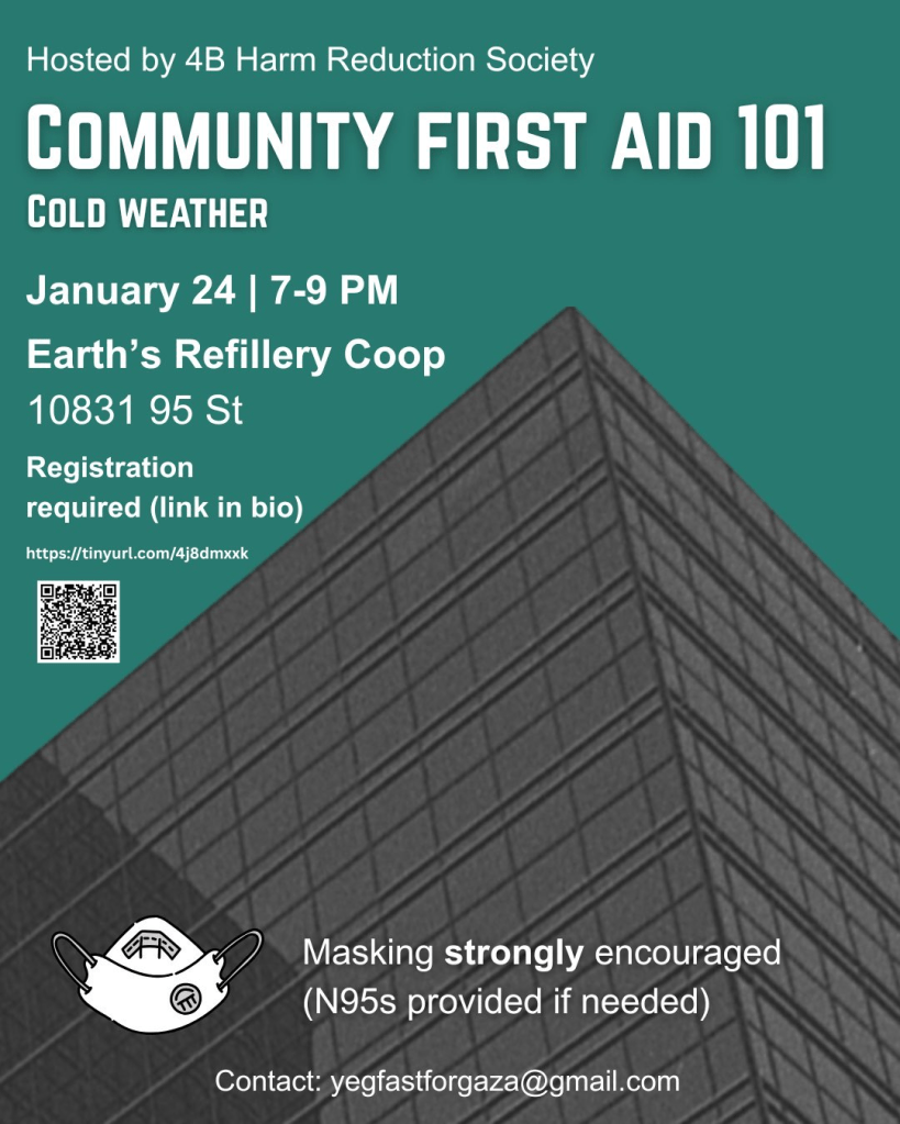 January 24th, Saturday – Community First Aid 101 (Cold Weather): “People who are living outside are especially vulnerable to cold weather, but anyone (housed or unhoused) can get frostbite, hypothermia, etc. or need overdose response. How can we offer to help in respectful ways, and what can we do? This workshop will be intro level; you don’t need any previous experience with first aid or medical training.”