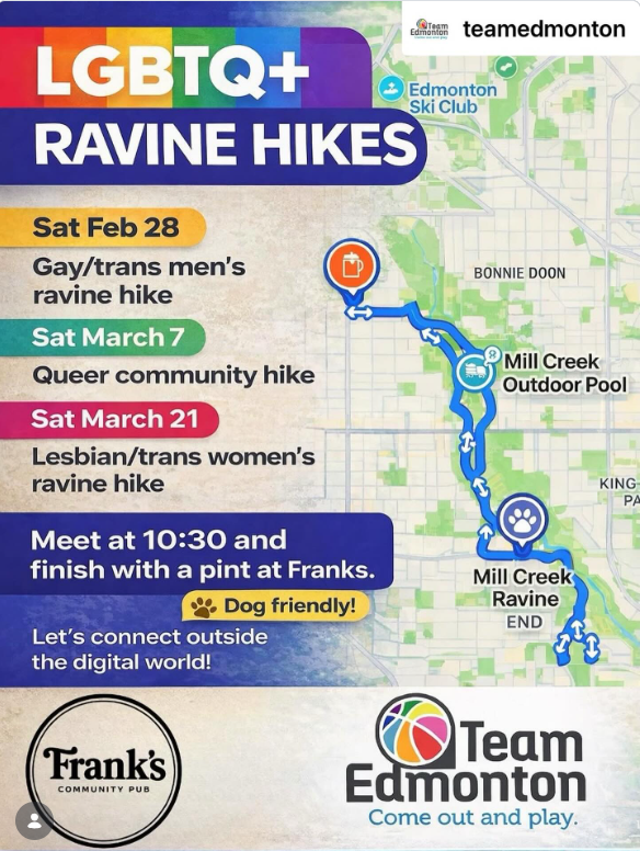 March 21st, Saturday – LGBTQ+ Ravine Hikes: “We are so excited to announce a series of Saturday Ravine Hikes! We’ll be exploring the beautiful Mill Creek trails, starting and ending our walk at @franksyeg