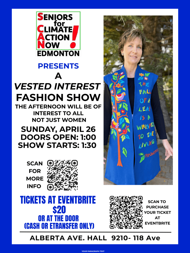 April 26th, Sunday – A Vested Interest Fashion Show: an art project: a light hearted presentation on a what can be an overwhelming topic – climate change; creative, quirky and sometimes humorous; full of stories people can identify with and maybe from there be willing to take an action.