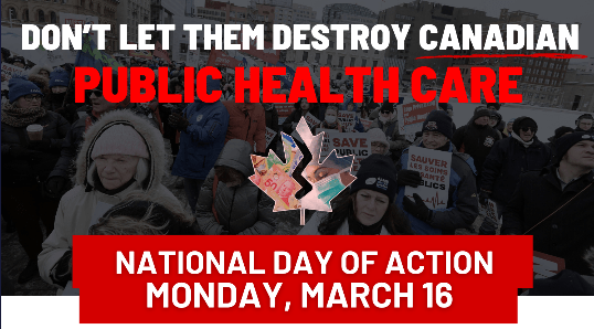 That’s why health coalitions across Canada are coordinating a Day of Action for Public Health Care on March 16, 2026, with in-person demonstrations held in communities from coast to coast!