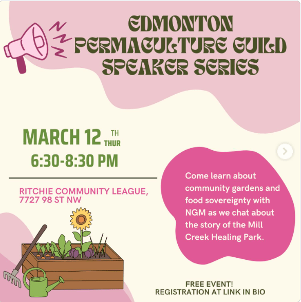 March 12th, Thursday – Millcreek Healing Park Presentation by the New Grocery Movement & Special Guest Edmonton Tool Library: “Learn community garden strategies from the New Grocery Movement. Discover how the Mill Creek Healing Park project combines food production, education, shared knowledge, accessibility, and neighbourhood connection.”