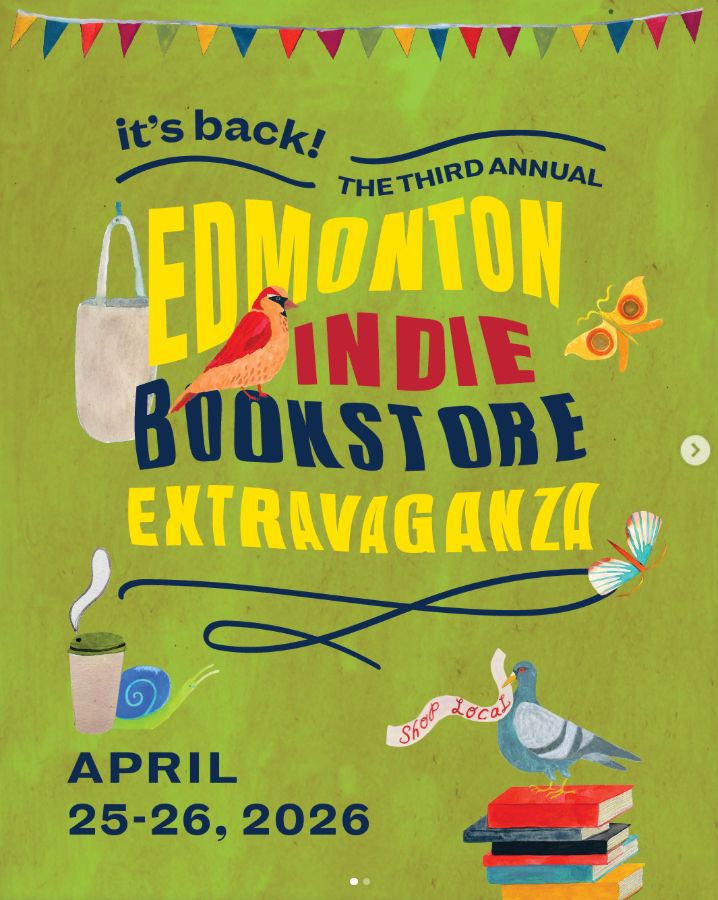 April 25th & 26th – Edmonton Indie Bookstore Extravaganza: “Bookmark this weekend as in SAVE THE DATE Y’ALL! It’s baaaack: the third annual Edmonton Indie Bookstore Extravaganza, happening on the weekend of Canadian Independent Bookstore Day (April 25, 2026). Sixteen indie bookstores, including two pop-ups, are participating, and we’ll have multiple giveaway prizes. Grab a passport at the first indie you visit, and use it as your guide to visiting as many indies as you can on that weekend! The more you visit, the more entries you get into the prize draws. Start planning early 🎉 more info coming soon!”