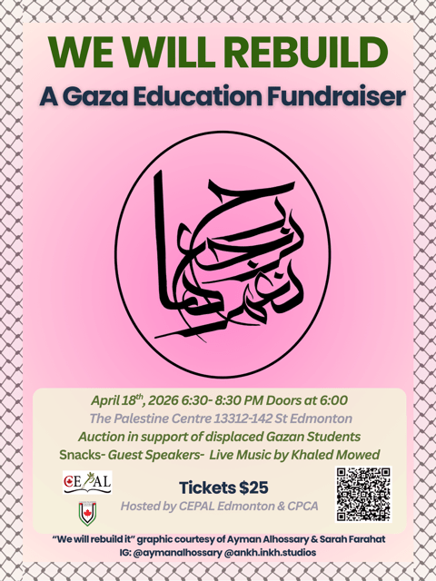 April 18th, Saturday – We Will Rebuild – Gaza Education Fundraiser: CEPAL Edmonton (Canadian Palestinian Education Exchange) is pleased to announce our major 2026 fundraiser. In 2025, we funded 2 students’ continued education through the generosity of Edmontonians. We’ve set our goals higher for 2026! We invite you to come out, hear from the program director and several of the students in Malaysia, and learn about CEPAL’s Higher Education Access for Palestine program.The evening will also feature music by world – renowned Munshed, Khaled Mowed.