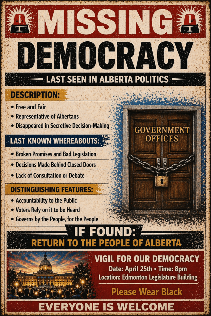 April 25th, Saturday – Missing Democracy: “Please join us for a vigil in memory of the loss of equality, compassion, accountability, and democracy in Alberta on Saturday April 25. The event takes place the evening prior to the Alberta Civil Society Summit and is a time for all of us to gather in solidarity and community to mourn the pillars of a healthy society. Please wear black. Remember a shield to catch wax drippings if you plan to bring a candle.