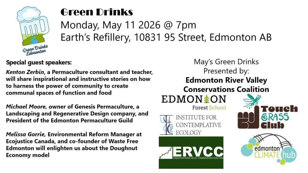 May 11th, Monday – Green Drinks: “An informal networking event for local green folks of all shapes and sizes! Green Drinks May 2026 is brought to you by the Edmonton River Valley Conservation Coalition and specially hosted by our friends at Earth’s Refillery Coop. Kitchen and Cafe will be open. Our featured guests are Michael Moore of Genesis Permaculture, Kenton Zerbin of Sustainable Attainable Academy, and Melissa Gorrie of Waste Free Edmonton.”