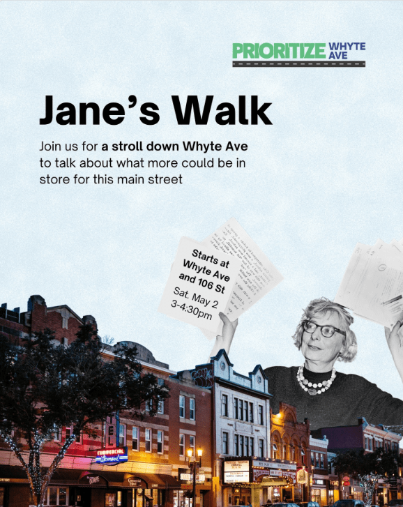 May 2nd, Saturday – Jane’s Walk on Whyte Avenue: “We’re hosting our first community event at the start of May! Come along for a walk/roll down Whyte Ave, as we discuss the opportunities to build a better main street that supports mobility, businesses, and more.