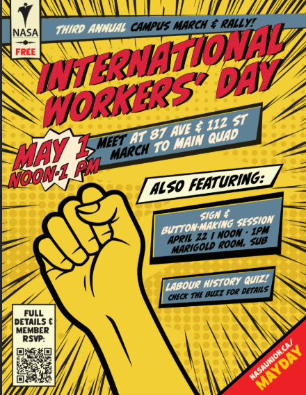 May 1st, Friday – International Workers’ Day: “The Non-Academic Staff Association at the University of Alberta will be hosting our annual International Workers’ Day March and Rally.