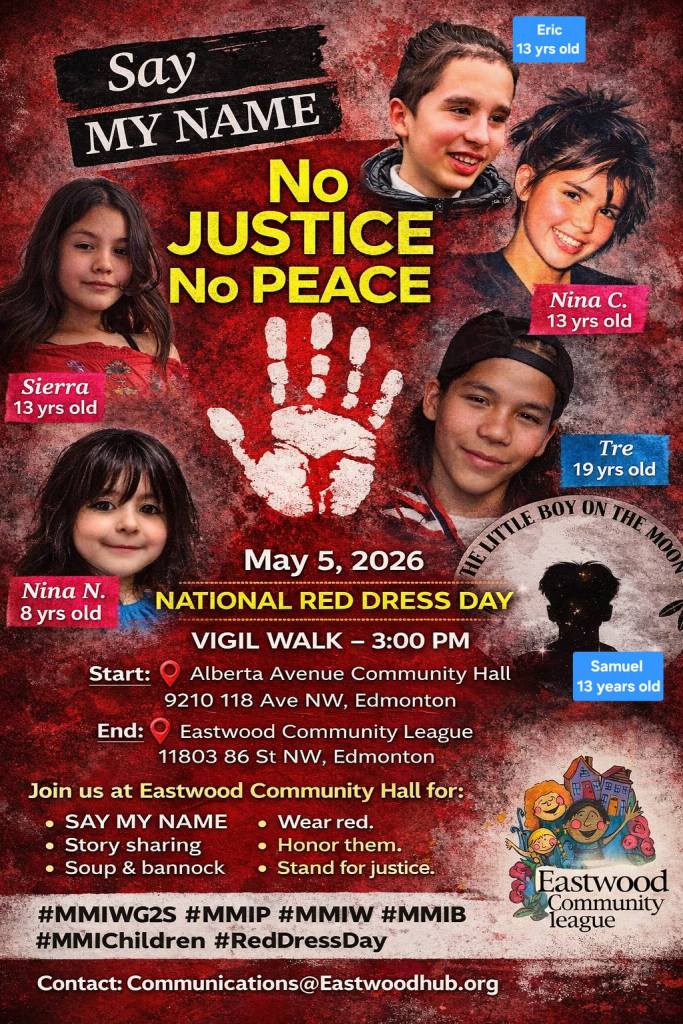 May 5th, Tuesday – National Red Dress Day Vigil Walk: “I invite you to support the National Red Dress Day Vigil Walk on May 5th, 2026, at 3:00 PM, honoring Missing and Murdered Indigenous Women, Girls, and 2SLGBTQI+ people. The walk starts at Alberta Avenue Community Hall (9210 118 Ave NW, Edmonton, AB T5G 0N4) and ends at Eastwood Community League (11803 86 St NW, Edmonton, AB T5B 3J9), where we will share stories, listen to Elders and Drummers, and enjoy refreshments.”