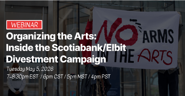 May 5th, Tuesday – Organizing the Arts: Inside the Scotiabank/Elbit Divestment Campaign: “In February 2026, Scotiabank—once the largest foreign investor in Israel’s largest weapons manufacturer, Elbit Systems—divested the last of its $500M stake. How did it happen, and what can organizers against Israeli apartheid around the world learn from it?