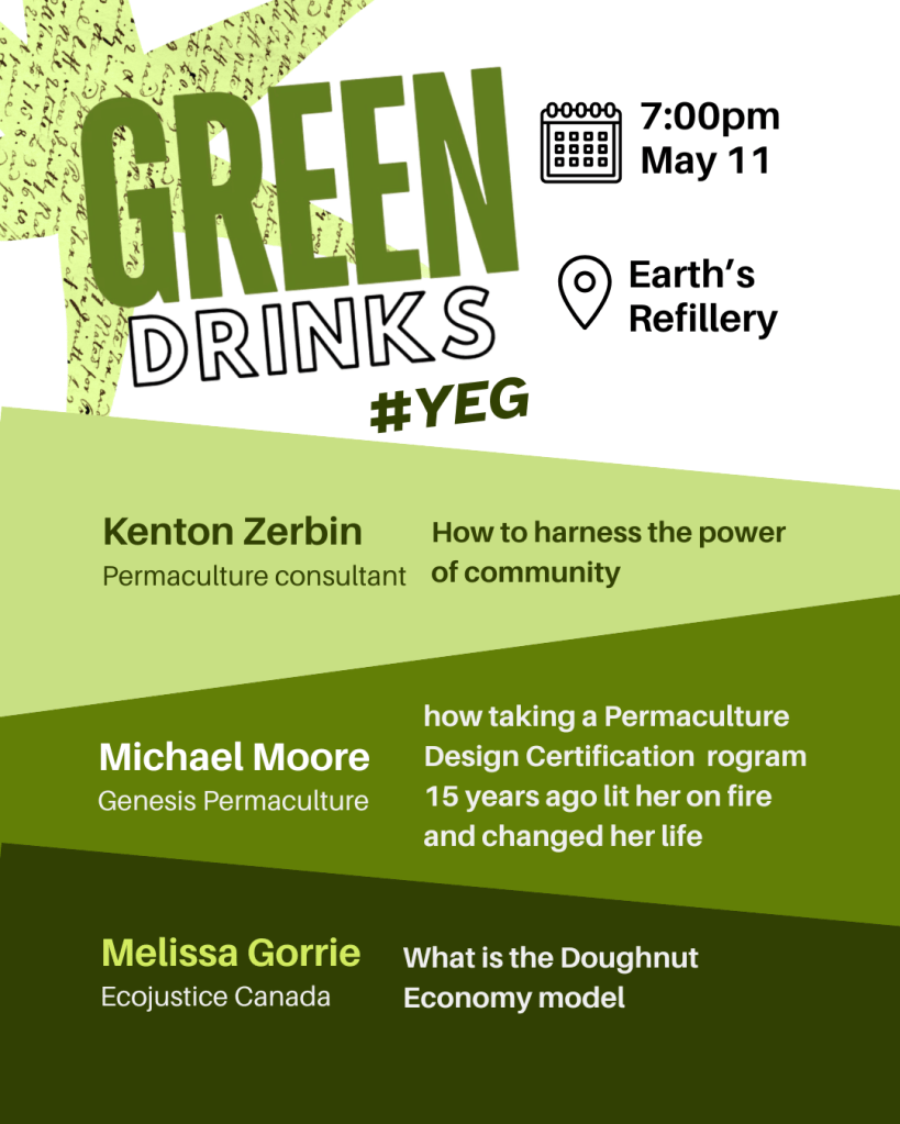 May 11th, Monday – Green Drinks: “An informal networking event for local green folks of all shapes and sizes! Green Drinks May 2026 is brought to you by the Edmonton River Valley Conservation Coalition and specially hosted by our friends at Earth’s Refillery Coop. The kitchen and Cafe will be open.
