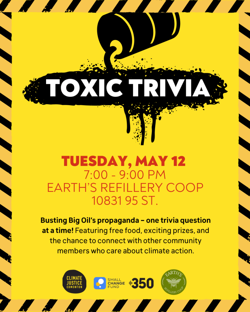 Climate Justice Edmonton (CJE) and Earth’s Refillery Coop (ERC) are hosting this Toxic Trivia party to expose Big Oil’s propaganda, and have some fun while doing it! Featuring free food, exciting prizes, and the chance to connect with other community members who care about climate action.